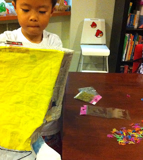 Then fill up piñata man with goodies and confetti! Kai loves doing this, and this year we put in some kuti kuti, which are quintessentially Singaporean. They are colorful tokens which children used to play with a LOOONG time ago.